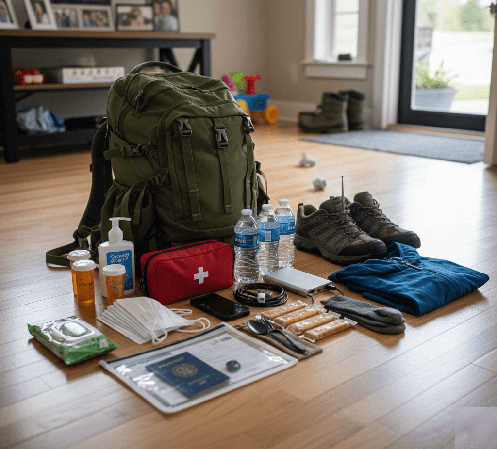 A go-bag keeps essentials in one place so you can leave quickly and calmly. Store it near your primary exit and keep it light enough to carry. If your household is larger, consider one bag per person plus a shared tote for items you’ll load into the car.